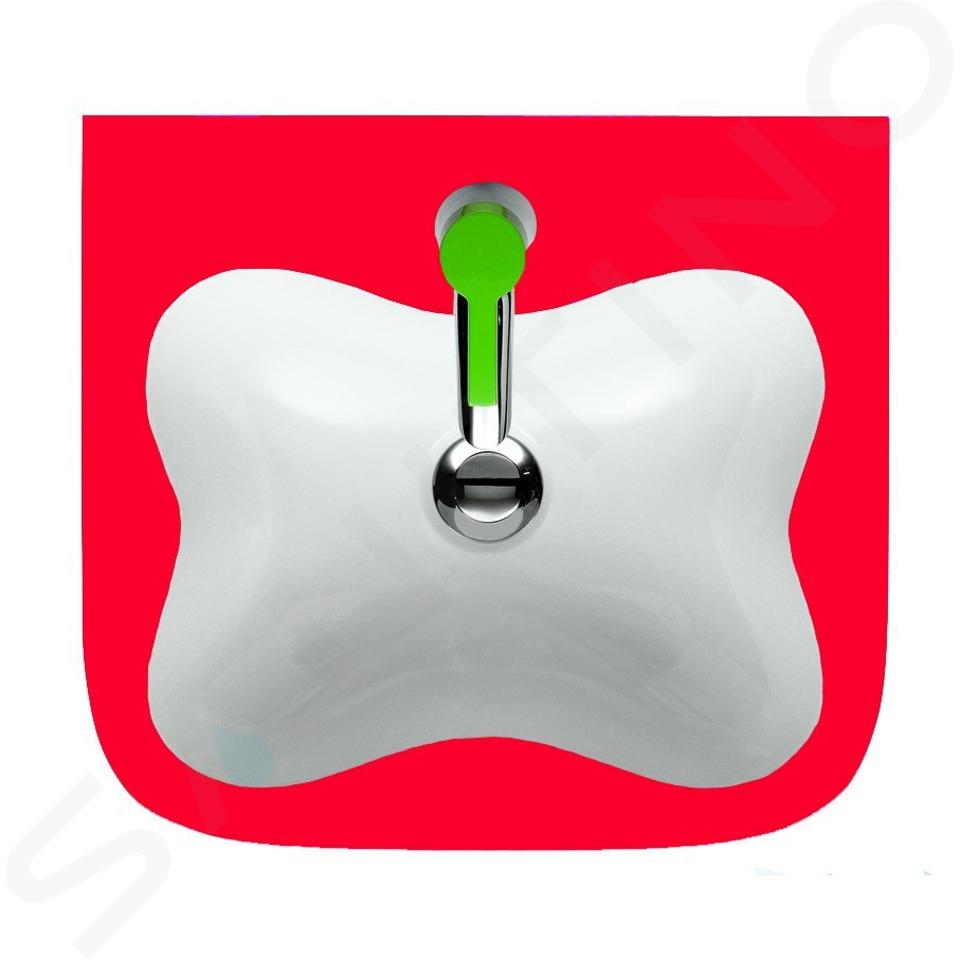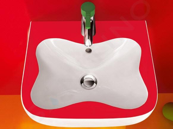 Kinderwastafel in de vorm van een grote bloem met één kraangat, met overloop